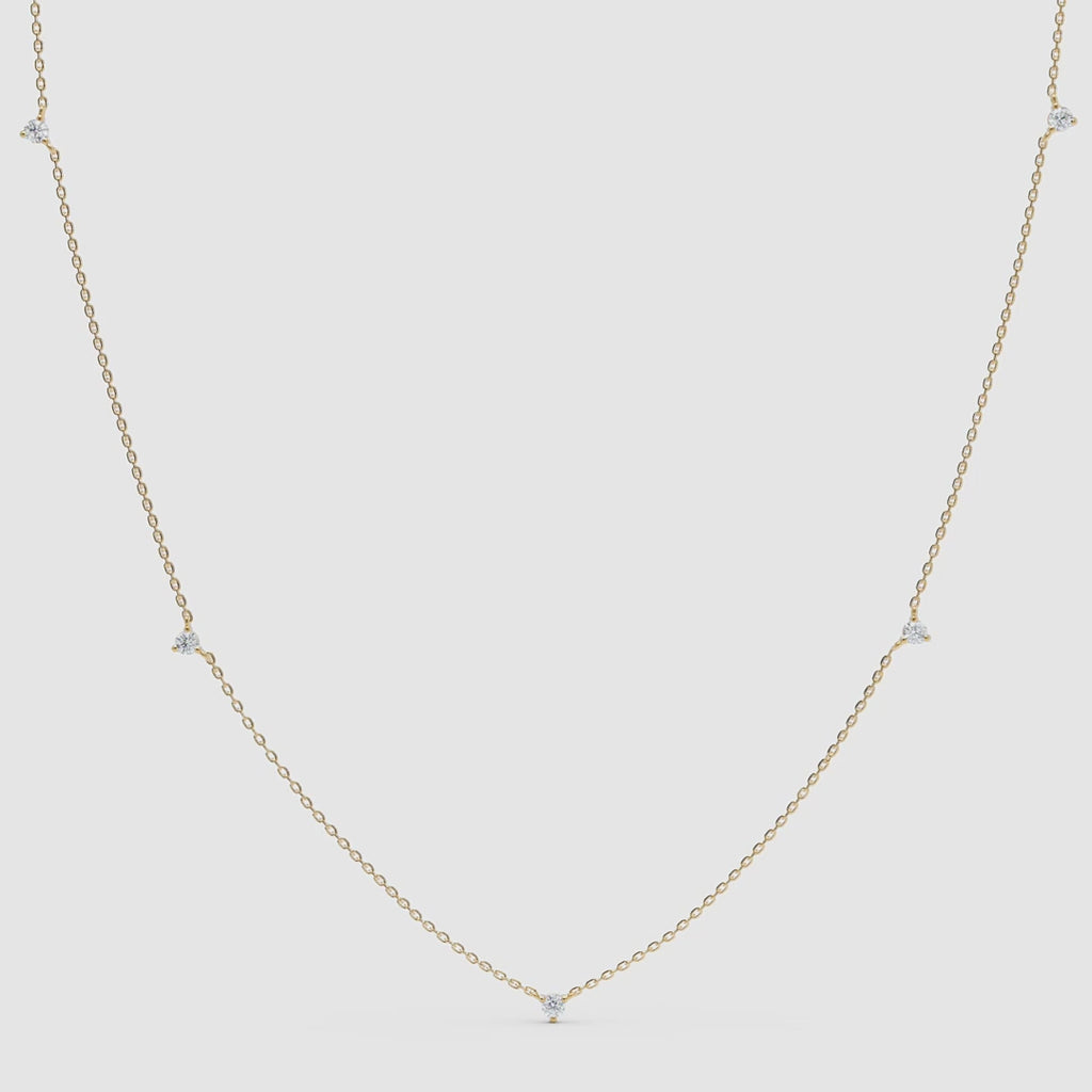 Colierul din aur cu diamante distribuite Dainty Diamond Station este o bijuterie delicată și rafinată, creată pentru a adăuga o strălucire subtilă și elegantă oricărei ținute. Designul minimalist, cu diamante fine dispuse de-a lungul lanțului, oferă un efect luminos discret și armonios.
